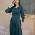 מפתח וי עדין, שרוולי פעמון עדינים בסיומת מנג׳ט עם כפתורים.